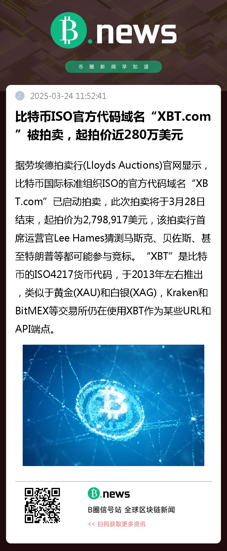 据劳埃德拍卖行(Lloyds Auctions)官网显示,比特币国际标准组织ISO的官方代码域名“XBT.com”已启动拍卖,此次拍卖将于3月28日结束,起拍价为2,798,917美元,该拍卖行首席运营官Lee Hames猜测马斯克、贝佐斯、甚至特朗普等都可能参与竞标。