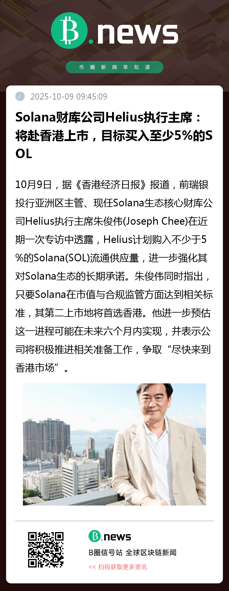 10月9日,据《香港经济日报》报道,前瑞银投行亚洲区主管、现任Solana生态核心财库公司Helius执行主席朱俊伟(Joseph Chee)在近期一次专访中透露,Helius计划购入不少于5%的Solana(SOL)流通供应量,进一步强化其对Solana生态的长期承诺。
