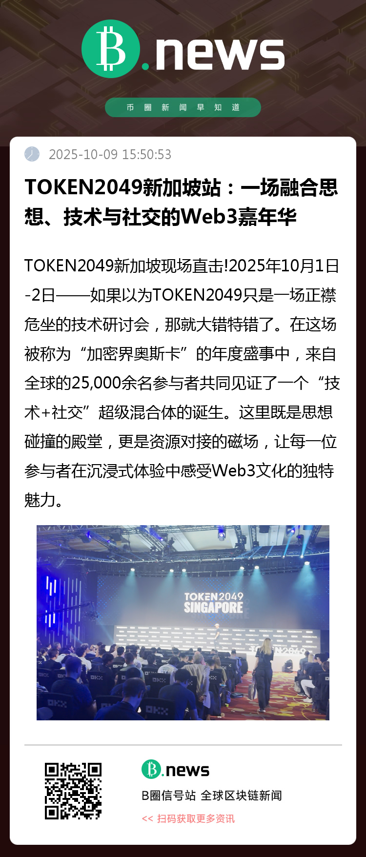 新加坡,2025年10月1日-2日——如果以为TOKEN2049只是一场正襟危坐的技术研讨会,那就大错特错了。在这场被称为“加密界奥斯卡”的年度盛事中,来自全球的25,000余名参与者共同见证了一个“技术+社交”超级混合体的诞生。这里既是思想碰撞的殿堂,更是资源对接的磁场,让每一位参与者在沉浸式体验中感受Web3文化的独特魅力。