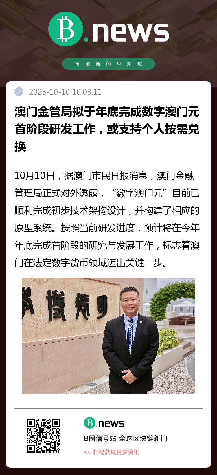 10月10日,据澳门市民日报消息,澳门金融管理局正式对外透露,“数字澳门元”目前已顺利完成初步技术架构设计,并构建了相应的原型系统。按照当前研发进度,预计将在今年年底完成首阶段的研究与发展工作,标志着澳门在法定数字货币领域迈出关键一步。