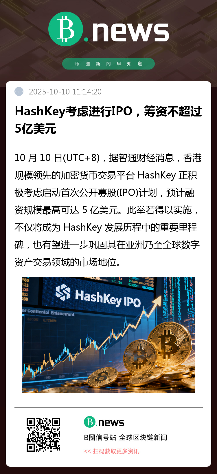 10 月 10 日(UTC+8),据智通财经消息,香港规模领先的加密货币交易平台 HashKey 正积极考虑启动首次公开募股(IPO)计划,预计融资规模最高可达 5 亿美元。此举若得以实施,不仅将成为 HashKey 发展历程中的重要里程碑,也有望进一步巩固其在亚洲乃至全球数字资产交易领域的市场地位。