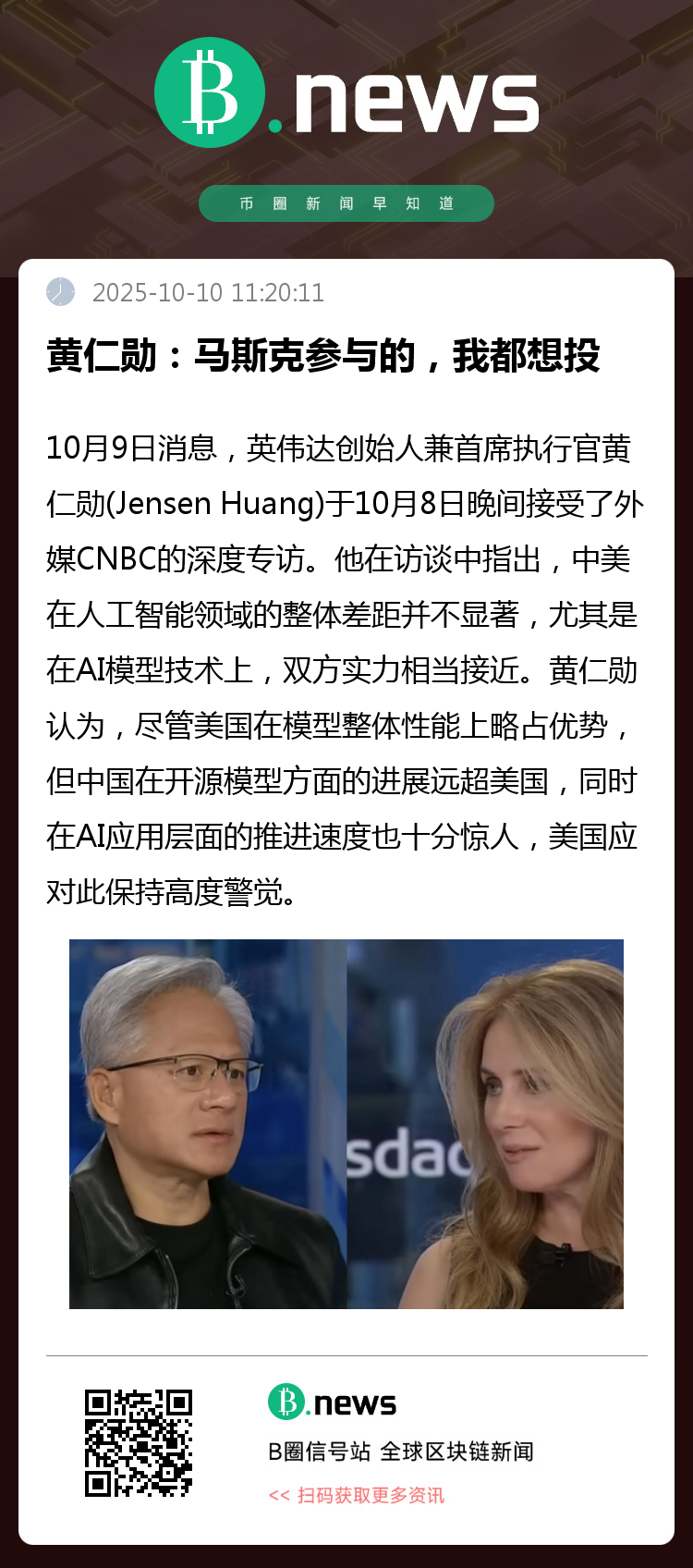 10月9日消息,英伟达创始人兼首席执行官黄仁勋(Jensen Huang)于10月8日晚间接受了外媒CNBC的深度专访。他在访谈中指出,中美在人工智能领域的整体差距并不显著,尤其是在AI模型技术上,双方实力相当接近。黄仁勋认为,尽管美国在模型整体性能上略占优势,但中国在开源模型方面的进展远超美国,同时在AI应用层面的推进速度也十分惊人,美国应对此保持高度警觉。