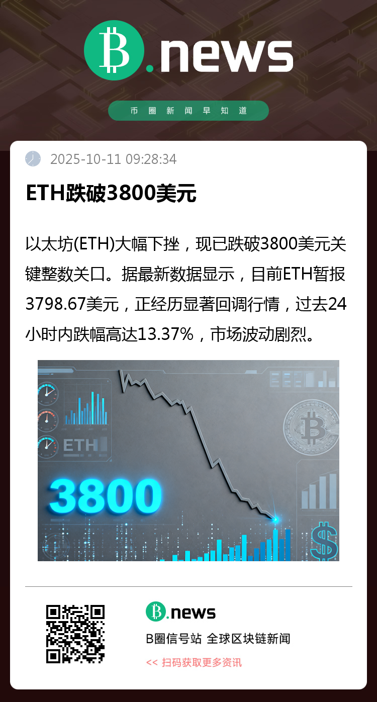 以太坊(ETH)大幅下挫,现已跌破3800美元关键整数关口。据最新数据显示,ETH暂报3798.67美元,正经历显著回调行情,过去24小时内跌幅高达13.37%,市场波动剧烈。