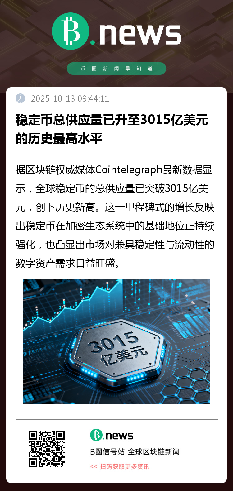 据区块链权威媒体Cointelegraph最新数据显示,全球稳定币总供应量已突破3015亿美元,创下历史新高。这一里程碑式的增长反映出稳定币在加密生态系统中的基础地位正持续强化,也凸显出市场对兼具稳定性与流动性的数字资产需求日益旺盛。