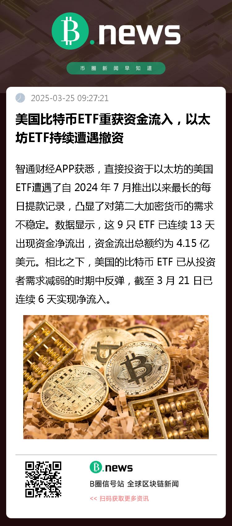 数据显示,这 9 只 ETF 已连续 13 天出现资金净流出,资金流出总额约为 4.15 亿美元。相比之下,美国的比特币 ETF 已从投资者需求减弱的时期中反弹,截至 3 月 21 日已连续 6 天实现净流入。