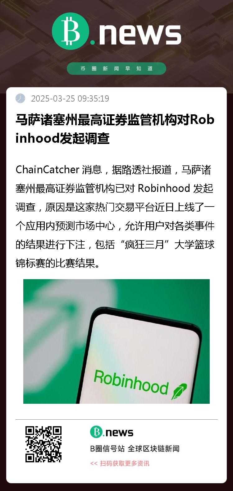 ChainCatcher 消息,据路透社报道,马萨诸塞州最高证券监管机构已对 Robinhood 发起调查,原因是这家热门交易平台近日上线了一个应用内预测市场中心,允许用户对各类事件的结果进行下注,包括“疯狂三月”大学篮球锦标赛的比赛结果。