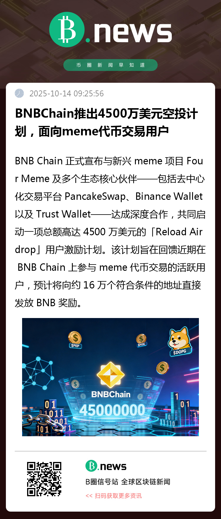 10月14日(UTC+8),BNB Chain 正式宣布与新兴 meme 项目 Four Meme 及多个生态核心伙伴——包括去中心化交易平台 PancakeSwap、Binance Wallet 以及 Trust Wallet——达成深度合作,共同启动一项总额高达 4500 万美元的「Reload Airdrop」用户激励计划。该计划旨在回馈近期在 BNB Chain 上参与 meme 代币交易的活跃用户,预计将向约 16 万个符合条件的地址直接发放 BNB 奖励。
