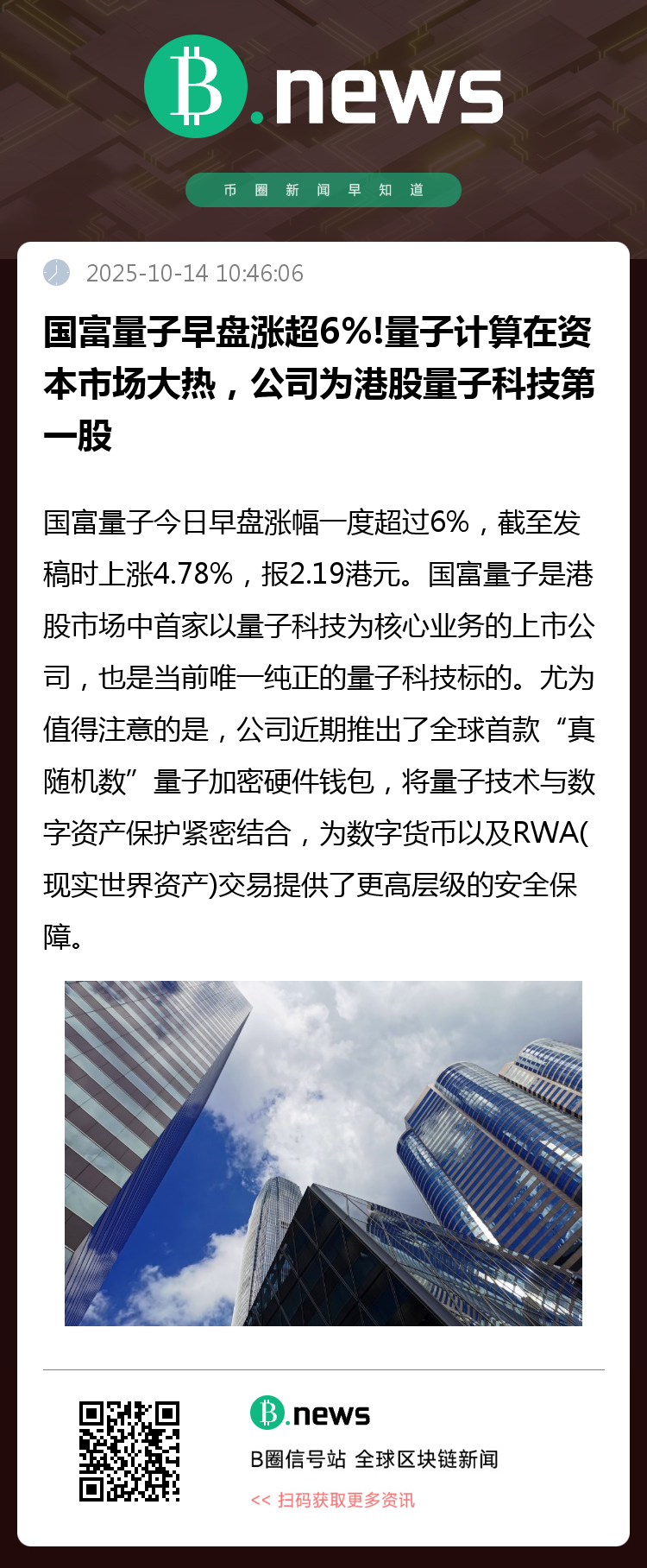 公开资料显示,国富量子是港股市场中首家以量子科技为核心业务的上市公司,也是当前唯一纯正的量子科技标的。从近期布局来看,公司于今年5月与夸密量子(创始人张文卓博士)共同成立合资公司,实质性开展量子科技相关的软硬件业务;6月又计划设立“量子比特机遇基金”,旨在推动量子科技与数字资产生态的深度融合。尤为值得注意的是,公司近期推出了全球首款“真随机数”量子加密硬件钱包,将量子技术与数字资产保护紧密结合,为数字货币及RWA(现实世界资产)交易提供了更高层级的安全保障。