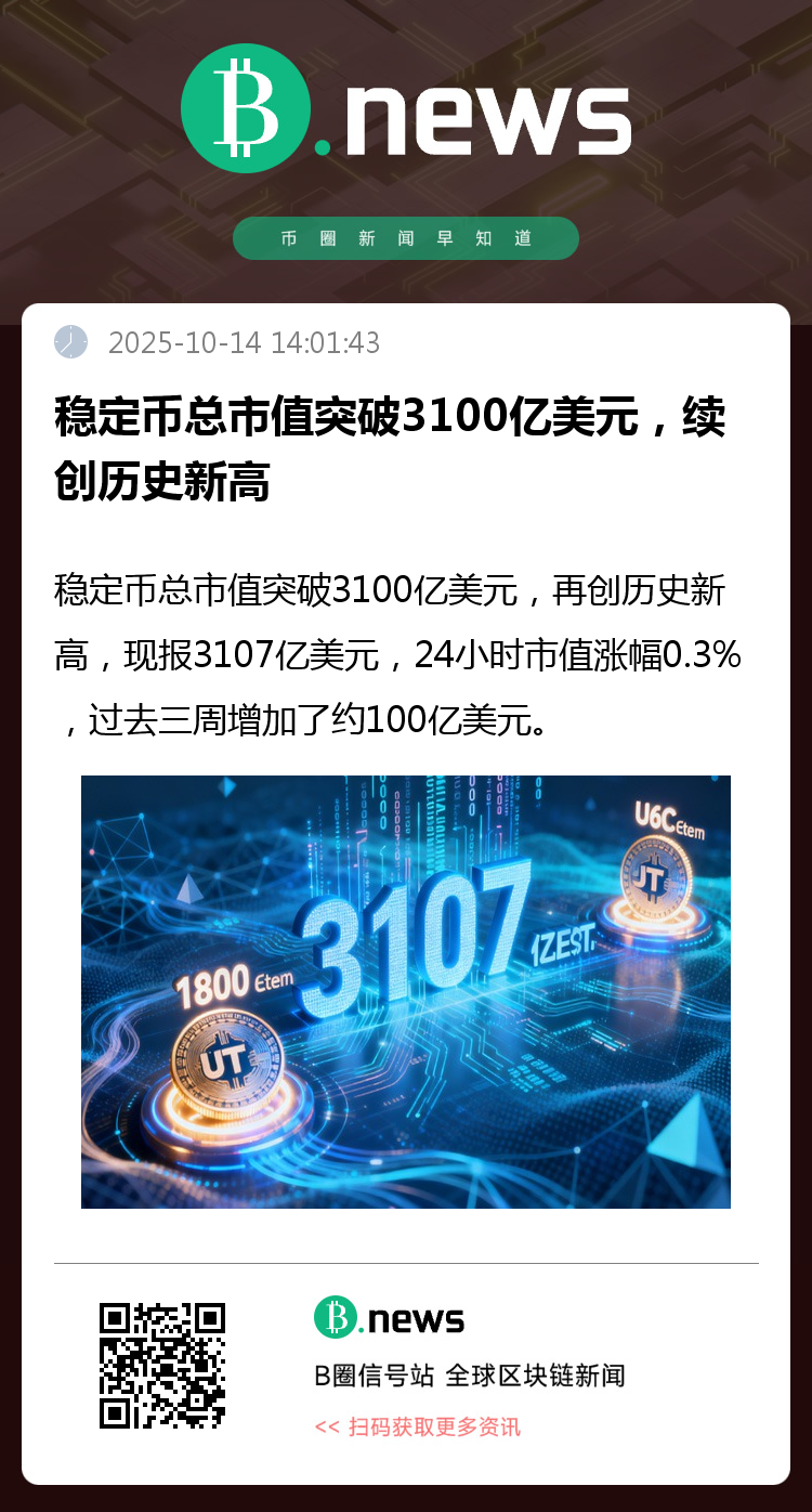 据Coingecko数据,稳定币总市值突破3100亿美元,再创历史新高,现报3107亿美元,24小时市值涨幅0.3%,过去三周增加了约100亿美元。其中USDT市值当前约1800亿美元位列第一,USDC市值760亿美元位列第二。值得注意的是,今年年初稳定币总市值约为2300亿美元,年内已增加超800亿美元。