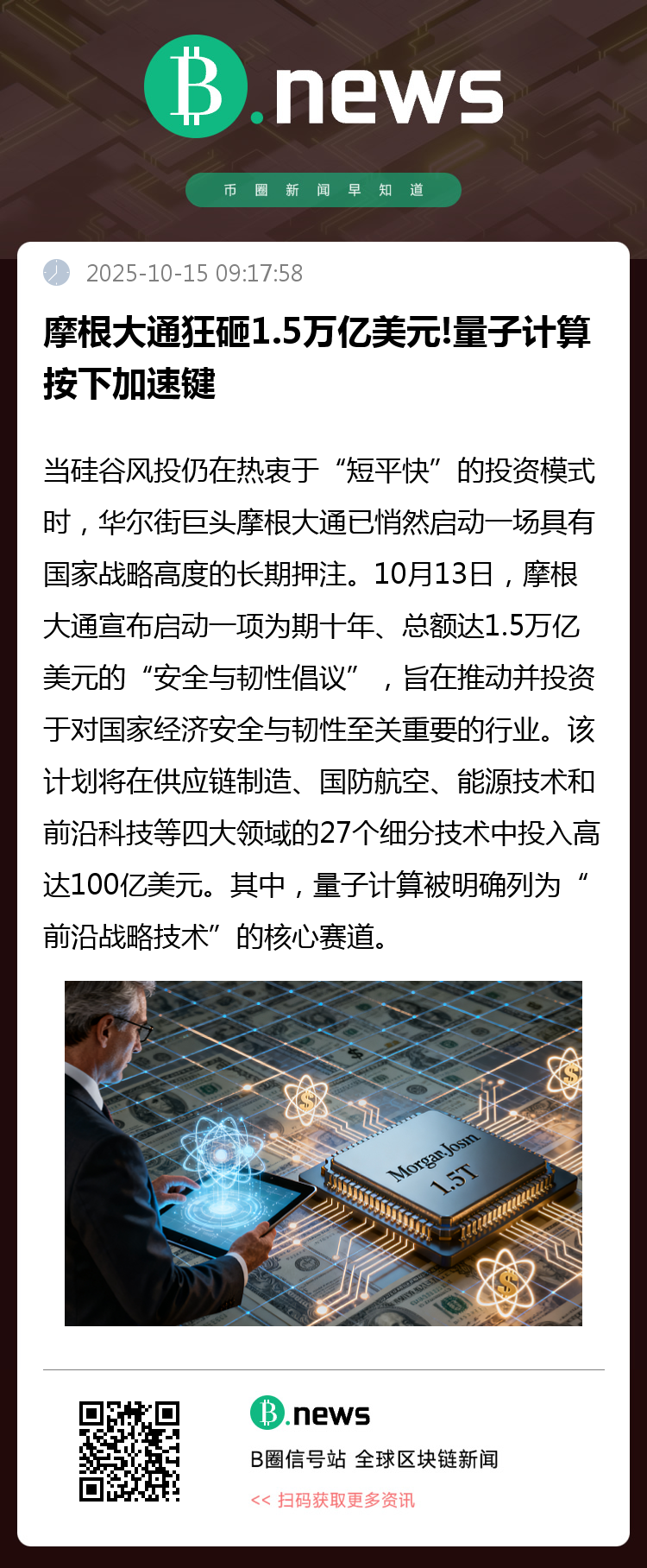 10月13日,摩根大通宣布启动一项为期十年、总额达1.5万亿美元的“安全与韧性倡议”,旨在推动并投资于对国家经济安全与韧性至关重要的行业。该计划将在供应链制造、国防航空、能源技术和前沿科技等四大领域的27个细分技术中投入高达100亿美元。其中,量子计算被明确列为“前沿战略技术”的核心赛道。