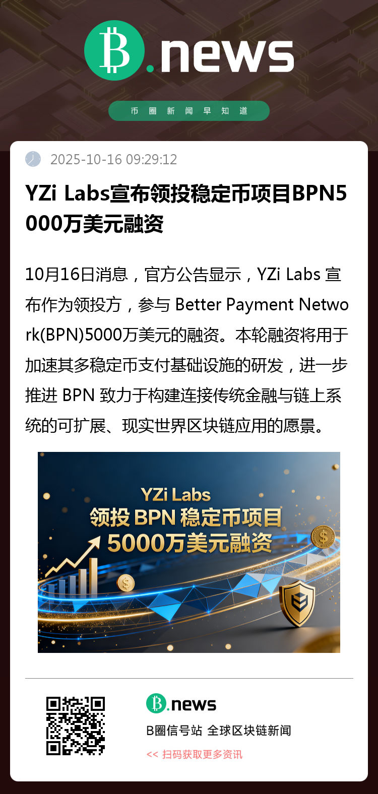 10月16日消息,官方公告显示,YZi Labs 宣布作为领投方,参与 Better Payment Network(BPN)5000万美元的融资。本轮融资将用于加速其多稳定币支付基础设施的研发,进一步推进 BPN 致力于构建连接传统金融与链上系统的可扩展、现实世界区块链应用的愿景。