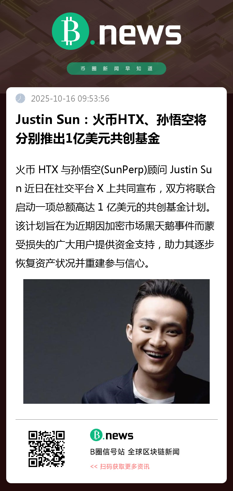 火币 HTX 与孙悟空(SunPerp)顾问 Justin Sun 近日在社交平台 X 上共同宣布,双方将联合启动一项总额高达 1 亿美元的共创基金计划。该计划旨在为近期因加密市场黑天鹅事件而蒙受损失的广大用户提供资金支持,助力其逐步恢复资产状况并重建参与信心。