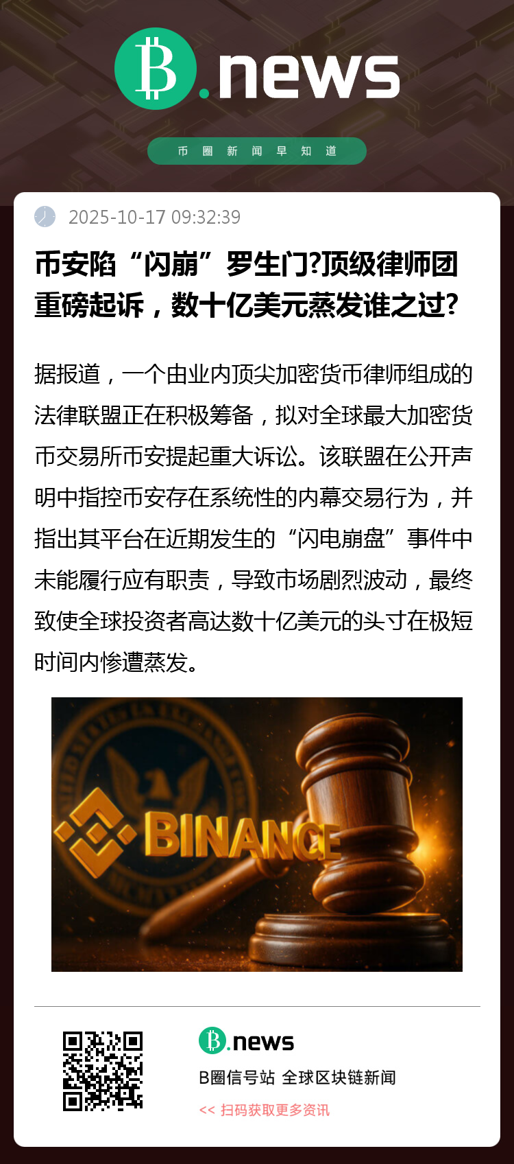 据报道,一个由业内顶尖加密货币律师组成的法律联盟正在积极筹备,拟对全球最大加密货币交易所币安提起重大诉讼。该联盟在公开声明中指控币安存在系统性的内幕交易行为,并指出其平台在近期发生的“闪电崩盘”事件中未能履行应有职责,导致市场剧烈波动,最终致使全球投资者高达数十亿美元的头寸在极短时间内惨遭蒸发。