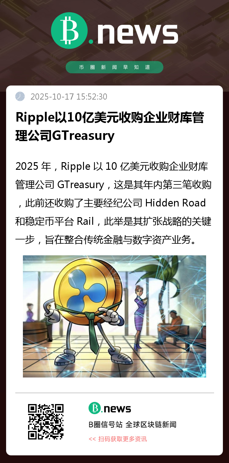 收购GTreasury标志着Ripple在2025年的第三笔收购,包括以12.5亿美元收购主要经纪公司Hidden Road和稳定币平台Rail。这两笔收购都突显了传统金融与数字金融之间日益增长的关系。