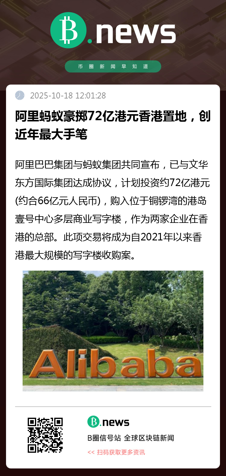 阿里巴巴集团与蚂蚁集团共同宣布,已与文华东方国际集团达成协议,计划投资约72亿港元(约合66亿元人民币),购入位于铜锣湾的港岛壹号中心多层商业写字楼,作为两家企业在香港的总部。此项交易将成为自2021年以来香港最大规模的写字楼收购案。