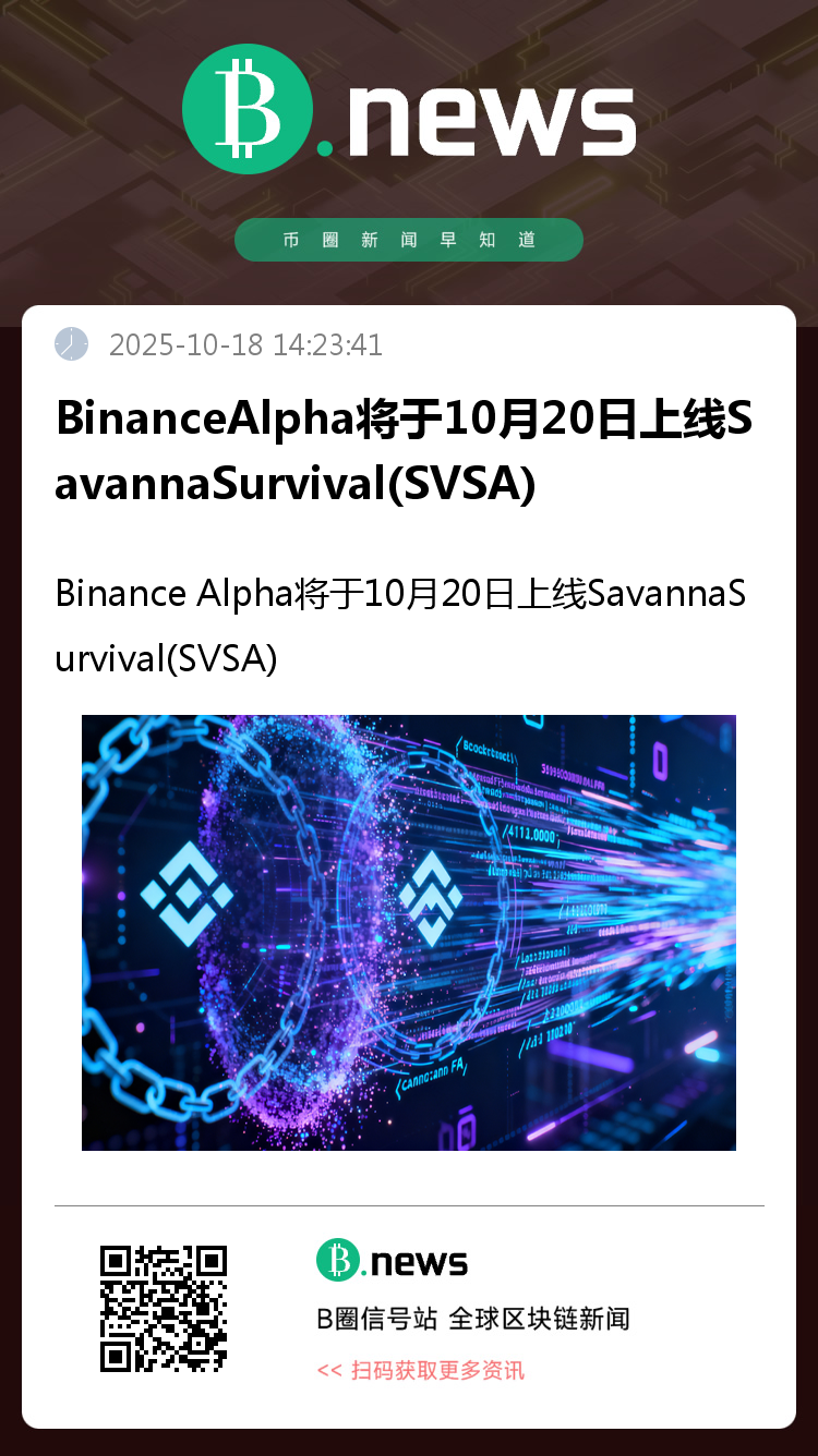 据官方消息,Binance Alpha将于10月20日上线SavannaSurvival(SVSA)。符合条件的用户可在Alpha活动页面使用Binance Alpha积分领取空投,交易开放后即可领取。