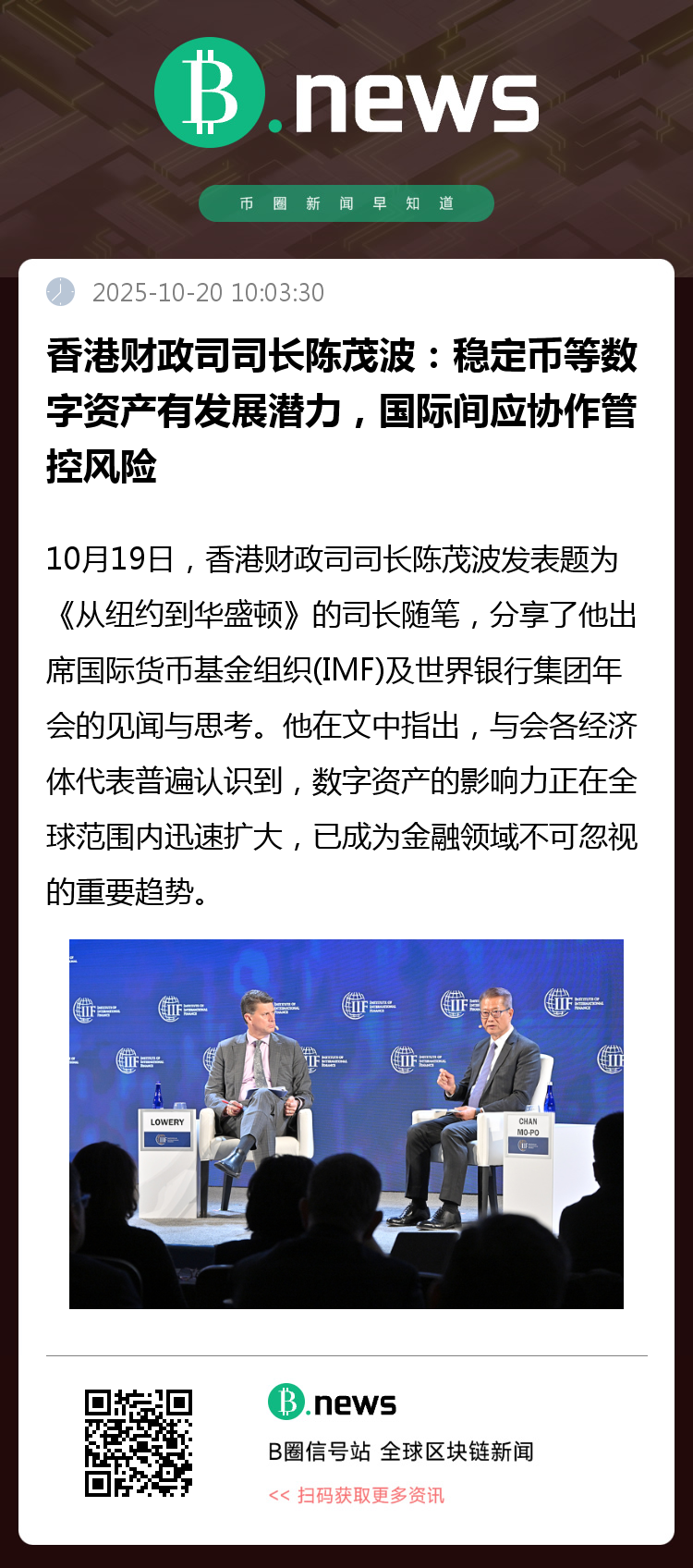 10月19日,香港财政司司长陈茂波发表题为《从纽约到华盛顿》的司长随笔,分享了他出席国际货币基金组织(IMF)及世界银行集团年会的见闻与思考。他在文中指出,与会各经济体代表普遍认识到,数字资产的影响力正在全球范围内迅速扩大,已成为金融领域不可忽视的重要趋势。
