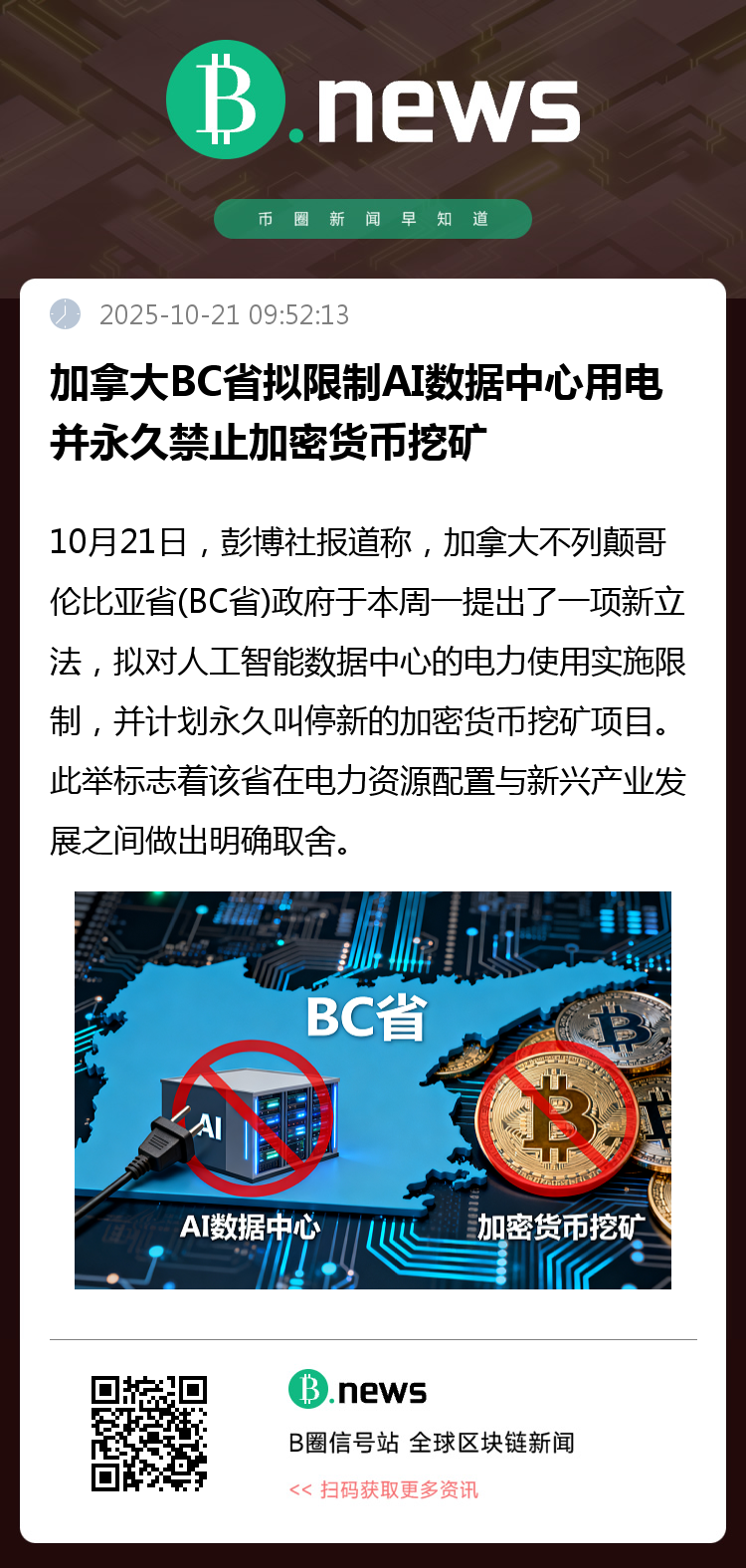 10月21日,彭博社报道称,加拿大不列颠哥伦比亚省(BC省)政府于本周一提出一项新立法,拟对人工智能数据中心的电力使用实施限制,并计划永久叫停新的加密货币挖矿项目。此举标志着该省在电力资源配置与新兴产业发展之间做出明确取舍。