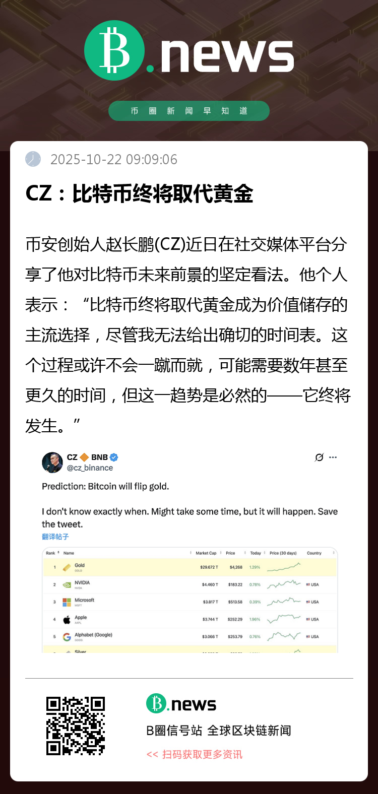 币安创始人赵长鹏(CZ)近日在社交媒体平台分享了他对比特币未来前景的坚定看法。他表示:“比特币终将取代黄金成为价值储存的主流选择,尽管我无法给出确切的时间表。这个过程或许不会一蹴而就,可能需要数年甚至更久的时间,但这一趋势是必然的——它终将发生。”