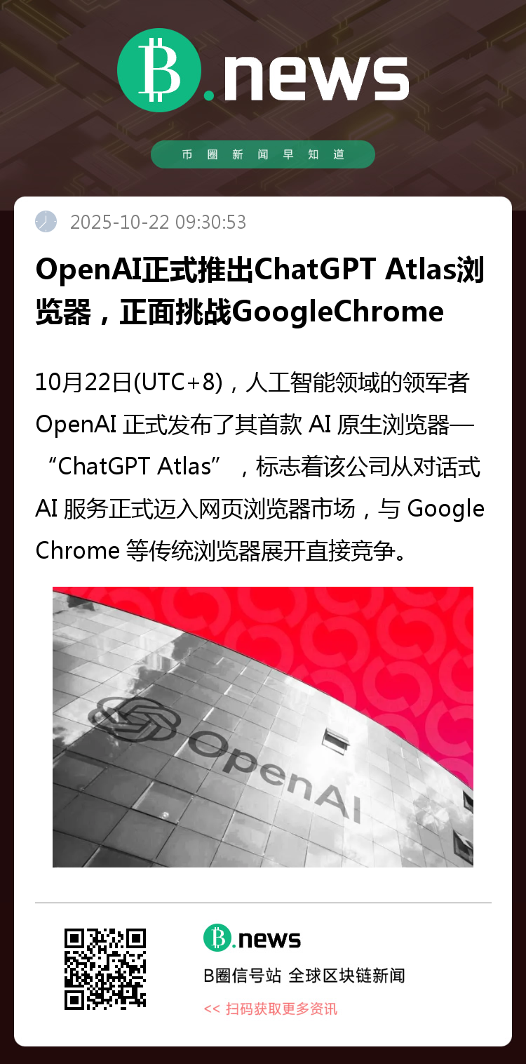 10月22日(UTC+8),人工智能领域的领军者 OpenAI 正式发布了其首款 AI 原生浏览器——“ChatGPT Atlas”,标志着该公司从对话式 AI 服务正式迈入网页浏览器市场,与 Google Chrome 等传统浏览器展开直接竞争。