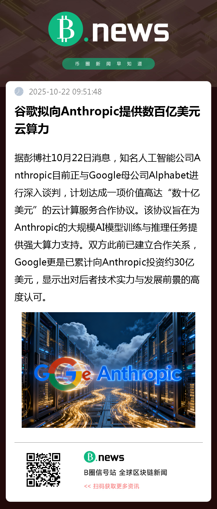据彭博社10月22日消息,知名人工智能公司Anthropic目前正与Google母公司Alphabet进行深入谈判,计划达成一项价值高达“数十亿美元”的云计算服务合作协议。该协议旨在为Anthropic的大规模AI模型训练与推理任务提供强大算力支持。