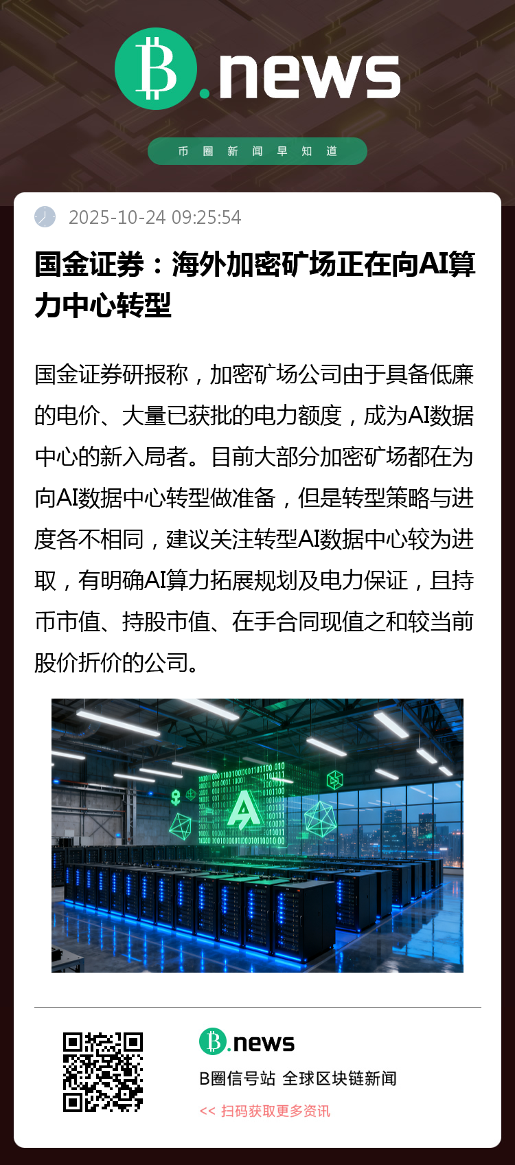 国金证券最新发布的研报指出,具备低电价资源和大量已获批电力配额的加密矿场企业,正凭借其独特的能源优势,逐步切入AI数据中心这一高增长赛道。