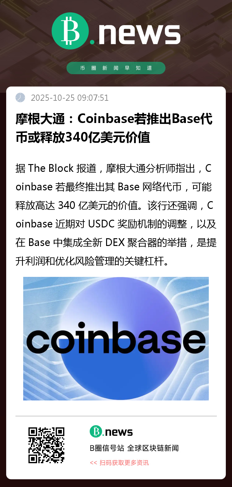 据 The Block 报道,摩根大通分析师指出,Coinbase 若最终推出其 Base 网络代币,可能释放高达 340 亿美元的价值。该行还强调,Coinbase 近期对 USDC 奖励机制的调整,以及在 Base 中集成全新 DEX 聚合器的举措,是提升利润和优化风险管理的关键杠杆。