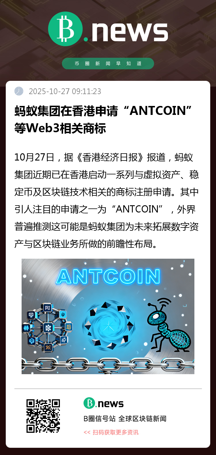 10月27日,据《香港经济日报》报道,蚂蚁集团近期已在香港启动一系列与虚拟资产、稳定币及区块链技术相关的商标注册申请。其中,引人注目的申请之一为“ANTCOIN”,外界普遍推测这可能是蚂蚁集团为未来拓展数字资产与区块链业务所做的前瞻性布局。