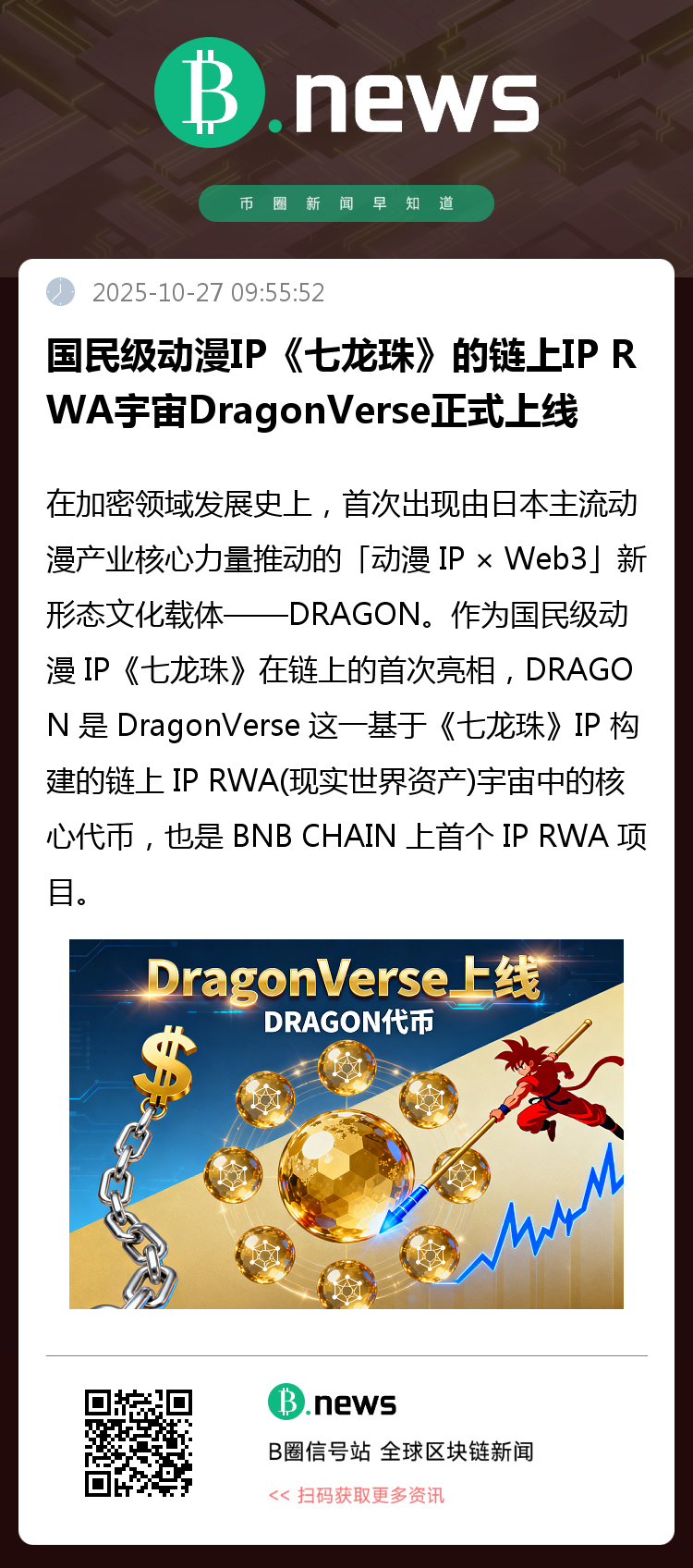 在加密领域发展史上,首次出现由日本主流动漫产业核心力量推动的「动漫 IP × Web3」新形态文化载体——DRAGON。作为国民级动漫 IP《七龙珠》在链上的首次亮相,DRAGON 是 DragonVerse 这一基于《七龙珠》IP 构建的链上 IP RWA(现实世界资产)宇宙中的核心代币,也是 BNB CHAIN 上首个 IP RWA 项目。