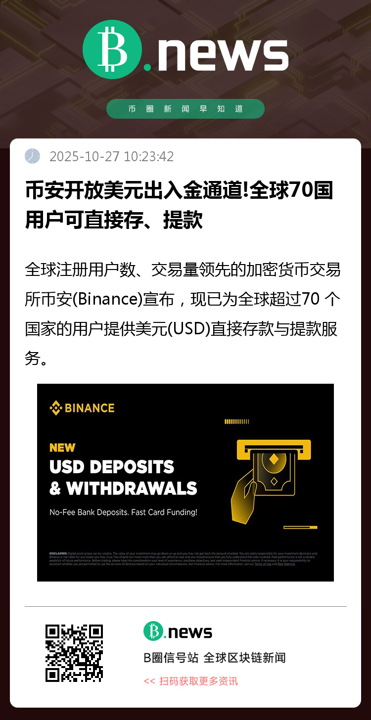 全球注册用户数、交易量领先的加密货币交易所币安(Binance)宣布,现已为全球超过70 个国家的用户提供美元(USD)直接存款与提款服务。