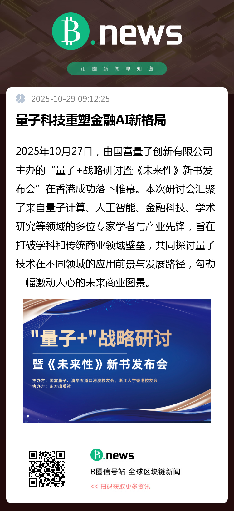 2025年10月27日,由国富量子创新有限公司(0290.HK,下称“国富量子”)主办的“量子+战略研讨暨《未来性》新书发布会”在香港圆满举行。本次会议汇集了量子计算、人工智能、金融科技与学术研究等领域的多位专家学者与产业先锋,旨在打破学科与行业壁垒,共同探索量子技术在不同场景中的应用前景与发展路径,勾勒出一幅充满潜力的未来商业图景。