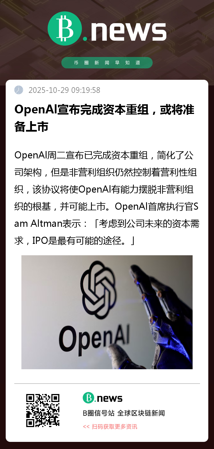 10月29日消息,OpenAI 于周二正式宣布已完成一轮资本重组,对公司整体架构进行了系统性简化。根据最新安排,原有的非营利组织仍将保持对营利性子公司的控制权。这一调整在保留其非营利初衷的同时,也为公司未来的战略发展提供了更大灵活性。该协议被视作 OpenAI 逐步摆脱纯粹非营利根基、迈向更开放市场结构的关键一步,也为公司潜在的公开上市铺平了道路。