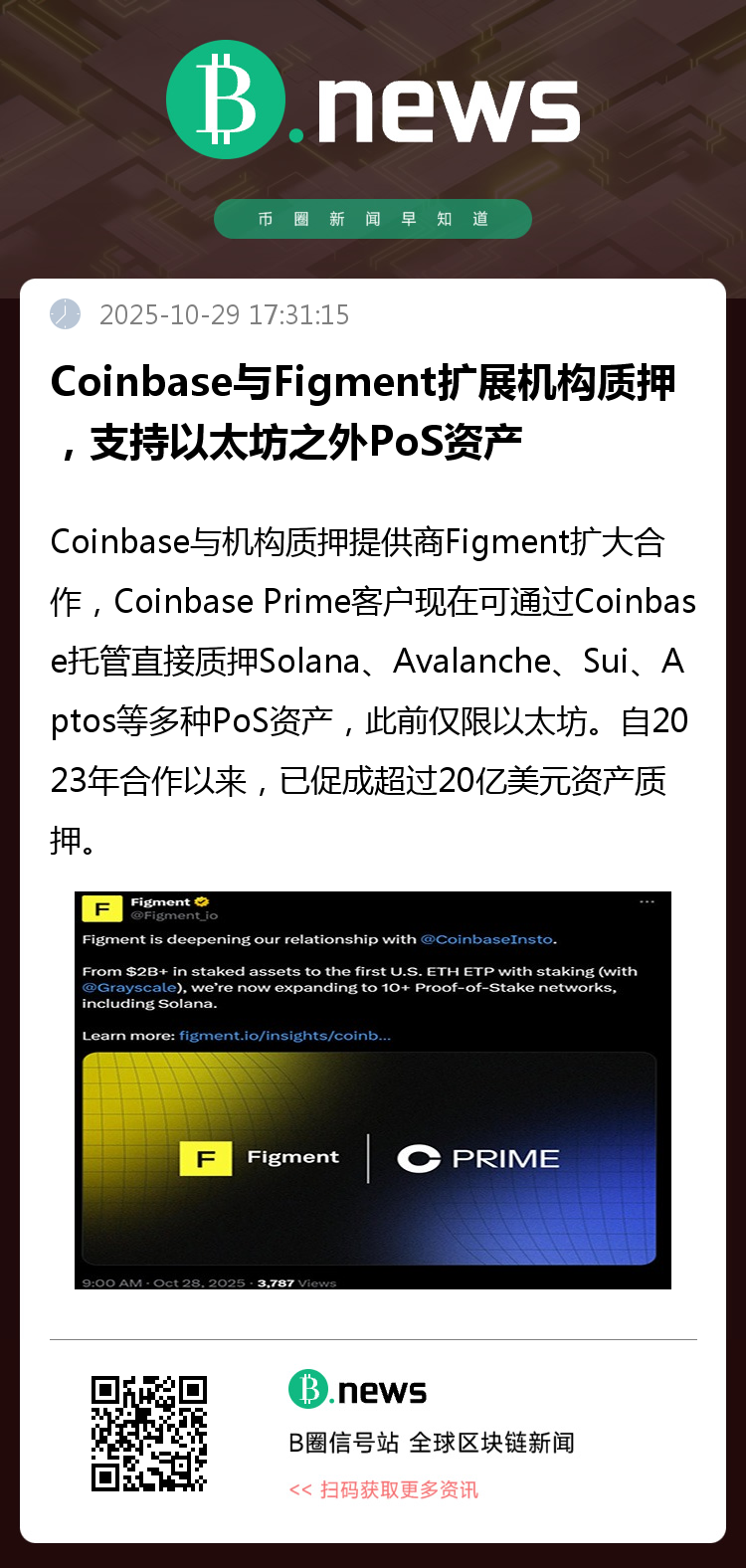 Coinbase与机构质押提供商Figment扩大合作,Coinbase Prime客户现在可通过Coinbase托管直接质押Solana、Avalanche、Sui、Aptos等多种PoS资产,此前仅限以太坊。自2023年合作以来,已促成超过20亿美元资产质押。