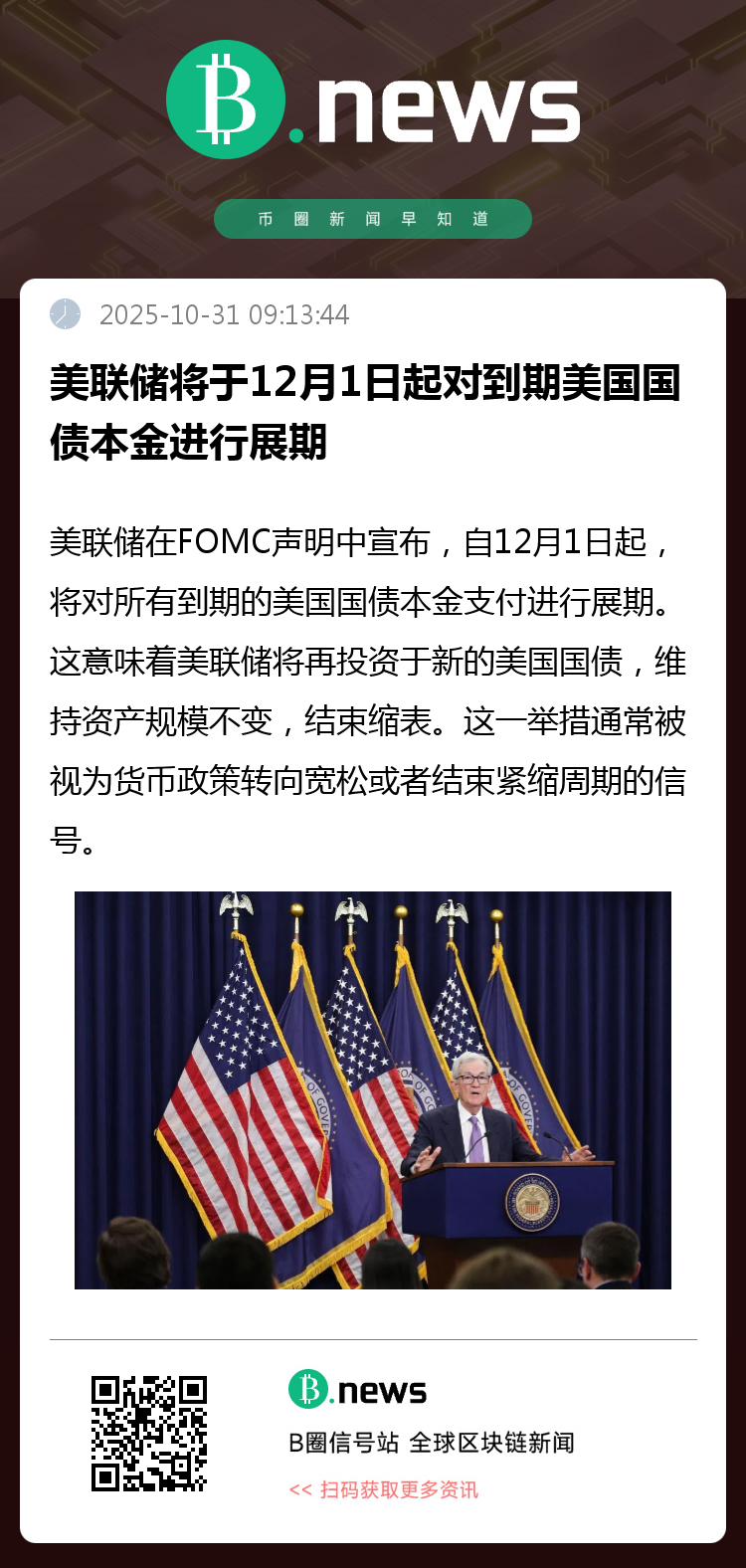 美联储联邦公开市场委员会(FOMC)在近期发布的政策声明中宣布,将自12月1日起,对系统公开市场账户(SOMA)中所有到期美国国债的本金支付进行全额再投资(展期)。