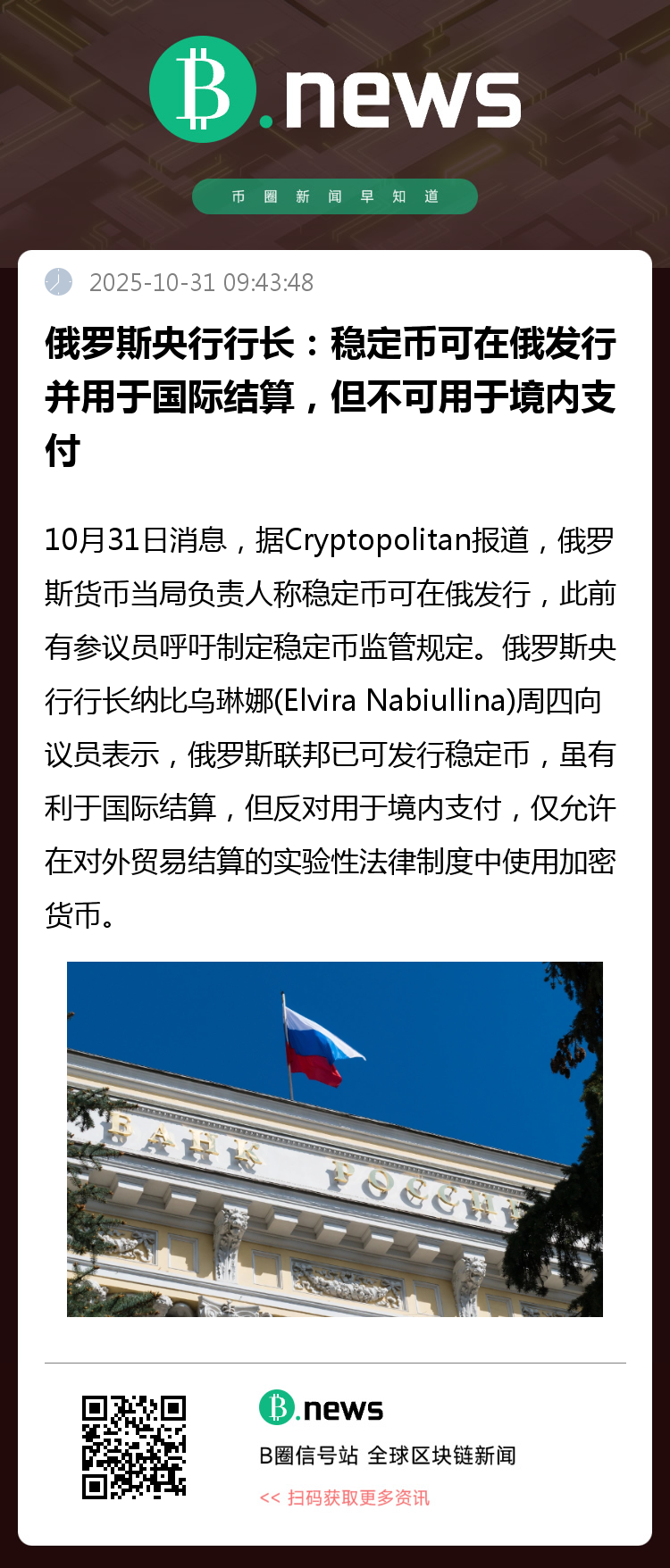 10月31日,据Cryptopolitan报道,俄罗斯货币当局负责人表示,俄罗斯已具备发行稳定币的条件。此前,有参议员呼吁制定稳定币相关监管规定。