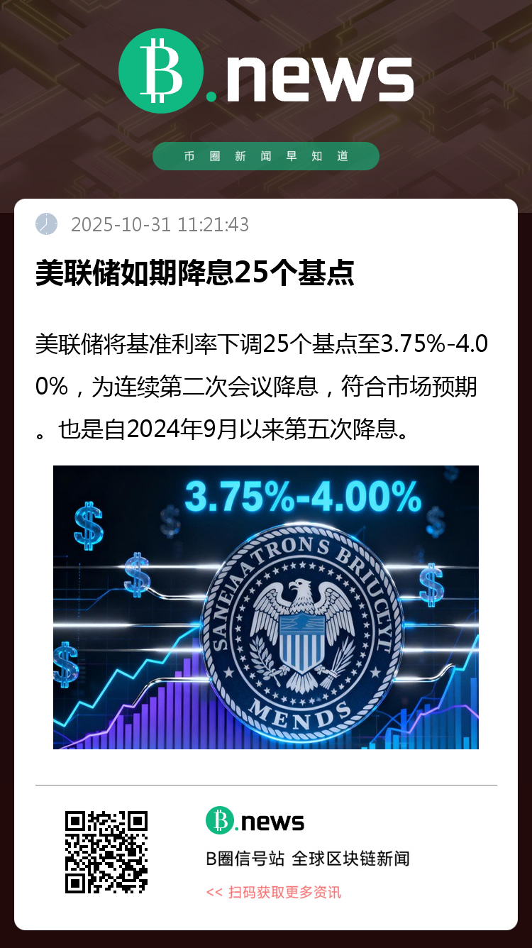 美联储将基准利率下调25个基点至3.75%-4.00%,为连续第二次会议降息,符合市场预期。也是自2024年9月以来第五次降息。