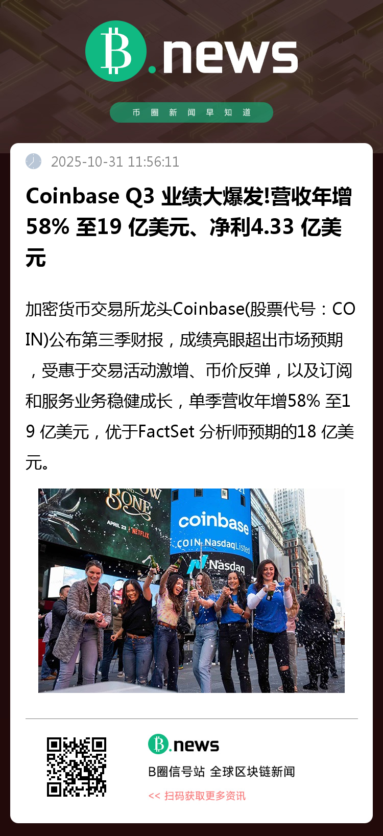 Coinbase 在致股东信中表示:「第三季是公司表现强劲的一季,我们取得了稳健的财务业绩,持续推出创新产品,并一步步奠定『万物交易所』的愿景基础。」