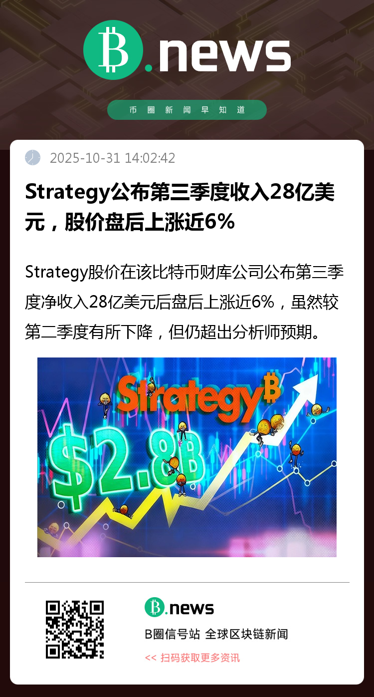 Strategy股价在该比特币财库公司公布第三季度净收入28亿美元后盘后上涨近6%,虽然较第二季度有所下降,但仍超出分析师预期。