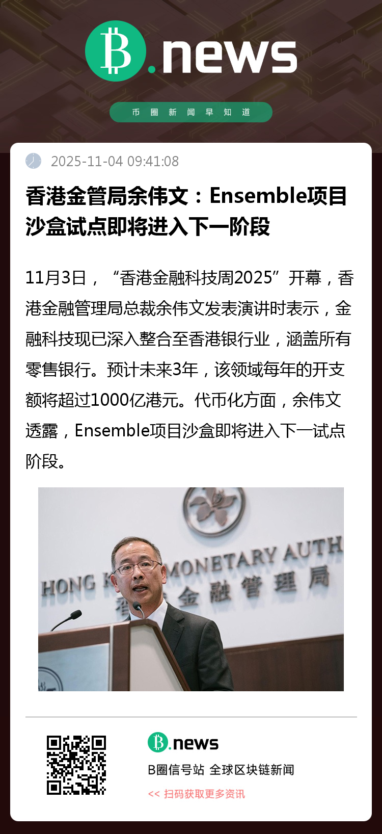 11月3日,“香港金融科技周2025”开幕,香港金融管理局总裁余伟文发表演讲时表示,金融科技现已深入整合至香港银行业,涵盖所有零售银行。预计未来3年,该领域每年的开支额将超过1000亿港元。