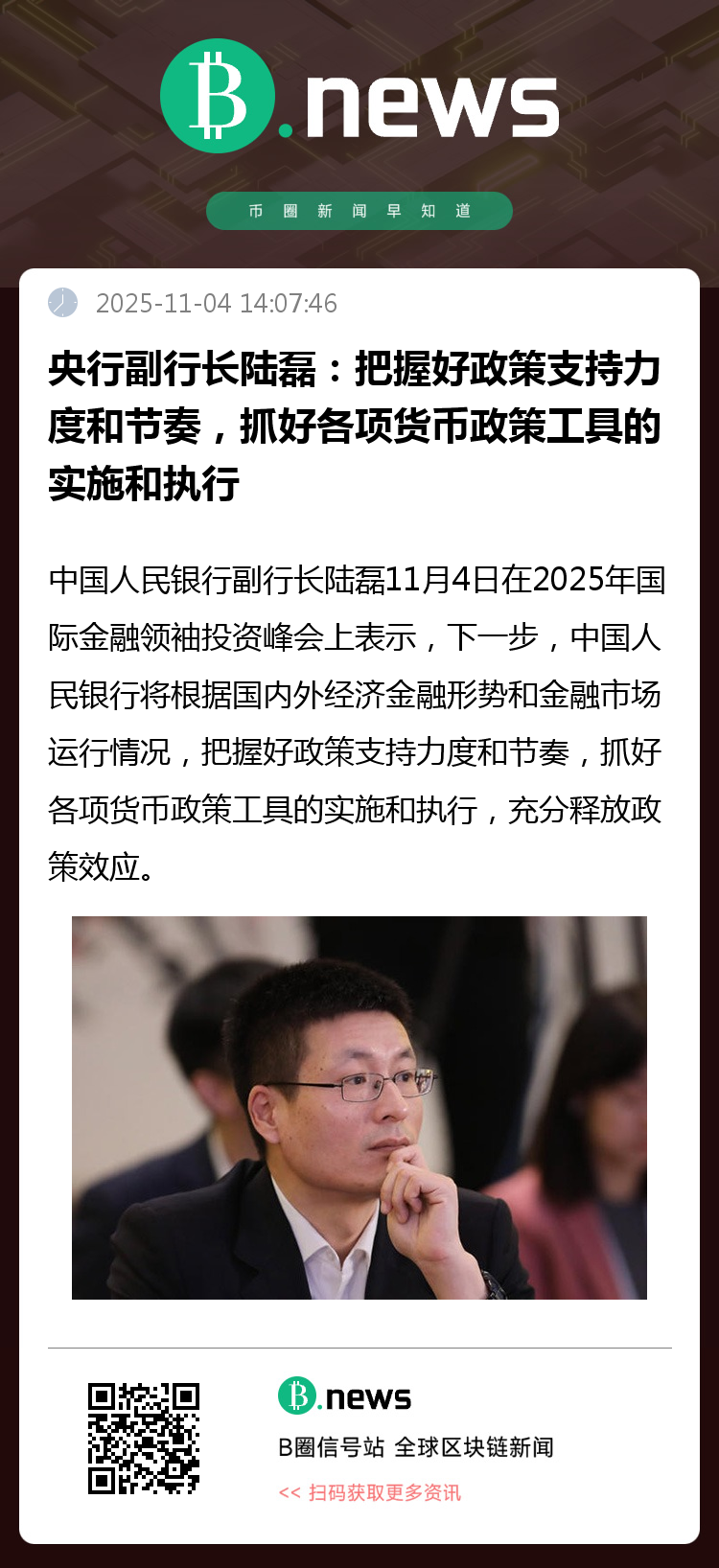 中国人民银行副行长陆磊11月4日在2025年国际金融领袖投资峰会上表示,下一步,中国人民银行将根据国内外经济金融形势和金融市场运行情况,把握好政策支持力度和节奏,抓好各项货币政策工具的实施和执行,充分释放政策效应。