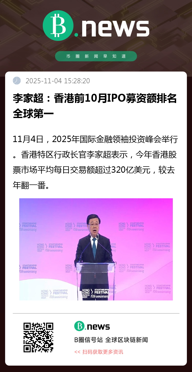 11月4日,2025年国际金融领袖投资峰会举行。香港特区行政长官李家超表示,今年香港股票市场平均每日交易额超过320亿美元,较去年翻一番。今年前10个月香港有80个IPO募资,总金额超260亿美元,IPO募资金额排名全球第一。“为了保持这一步伐,香港积极推动许多改革,允许海外公司融资贸易风险管理提升效率,并推动人民币股票交易。”李家超表示:“我们决心将香港发展成为数字资产的全球中心,与监管者共同合作为未来做好准备,目的是保证数字资产在未来的健康和可持续发展。除了牌照,香港还有沙盒项目,使金融科技应用能够在受控环境中进行测试。”