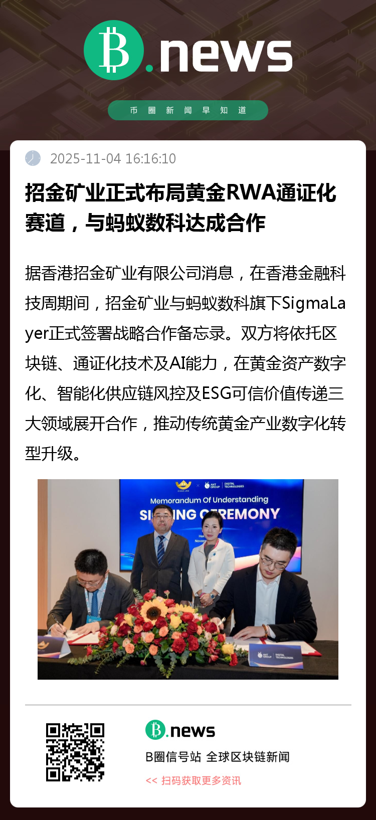 11月4日消息,据香港招金矿业有限公司消息,在2025年11月3日举办的香港金融科技周期间,招金矿业与蚂蚁数科旗下SigmaLayer共同签署战略合作备忘录。双方将基于区块链、通证化技术及人工智能等前沿科技,围绕黄金资产数字化、智能化供应链风控以及ESG(环境、社会与治理)可信价值传递三大核心领域展开深度合作,协力推动传统黄金产业的数字化转型升级。
