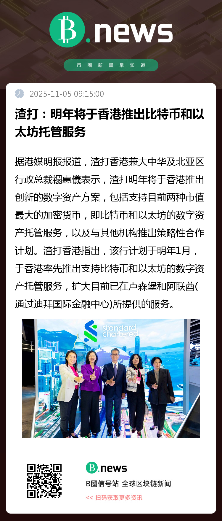 随着数字资产逐渐被传统金融体系所接纳,渣打此次的战略部署,有望为机构及高净值客户提供更安全、合规的数字资产存储与管理解决方案,进一步连接传统金融与虚拟资产生态,助力香港巩固其在亚太地区数字金融创新中的领先地位。