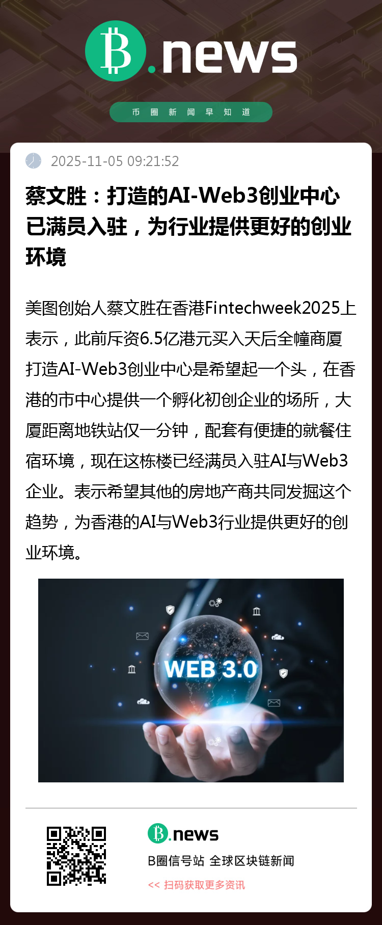 在2025年香港金融科技周(Fintech Week)上,美图公司创始人蔡文胜表示,此前以6.5亿港元购入位于香港天后的一整栋商厦,旨在打造一个专注于AI与Web3领域的创业中心。此举意在率先行动,于香港核心区域为初创企业提供孵化场所。该大厦位置优越,距离地铁站仅一分钟步行路程,周边配备完善的餐饮与住宿设施。目前,整栋楼已全部租罄,入驻企业均为AI和Web3相关公司。