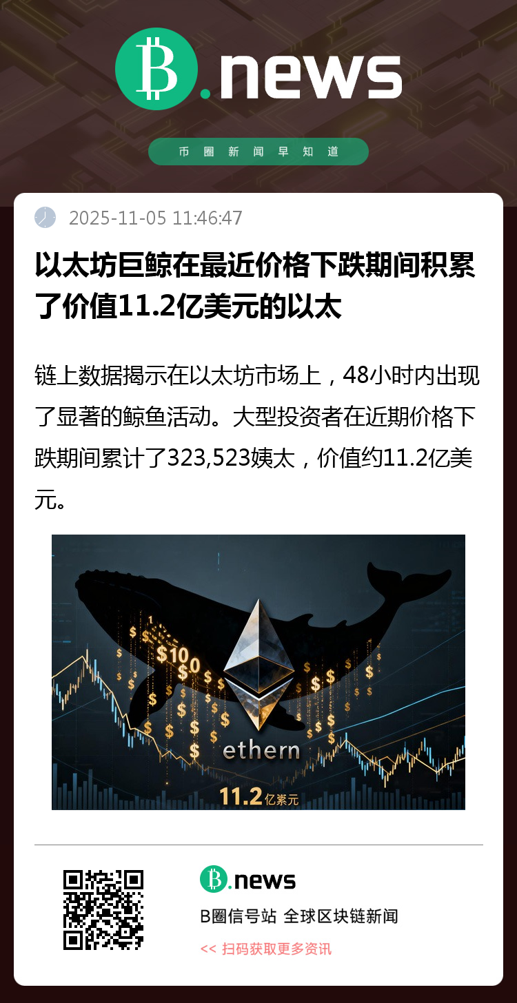 链上数据揭示在以太坊市场上,48小时内出现了显著的鲸鱼活动。大型投资者在近期价格下跌期间累计了323,523姨太,价值约11.2亿美元。