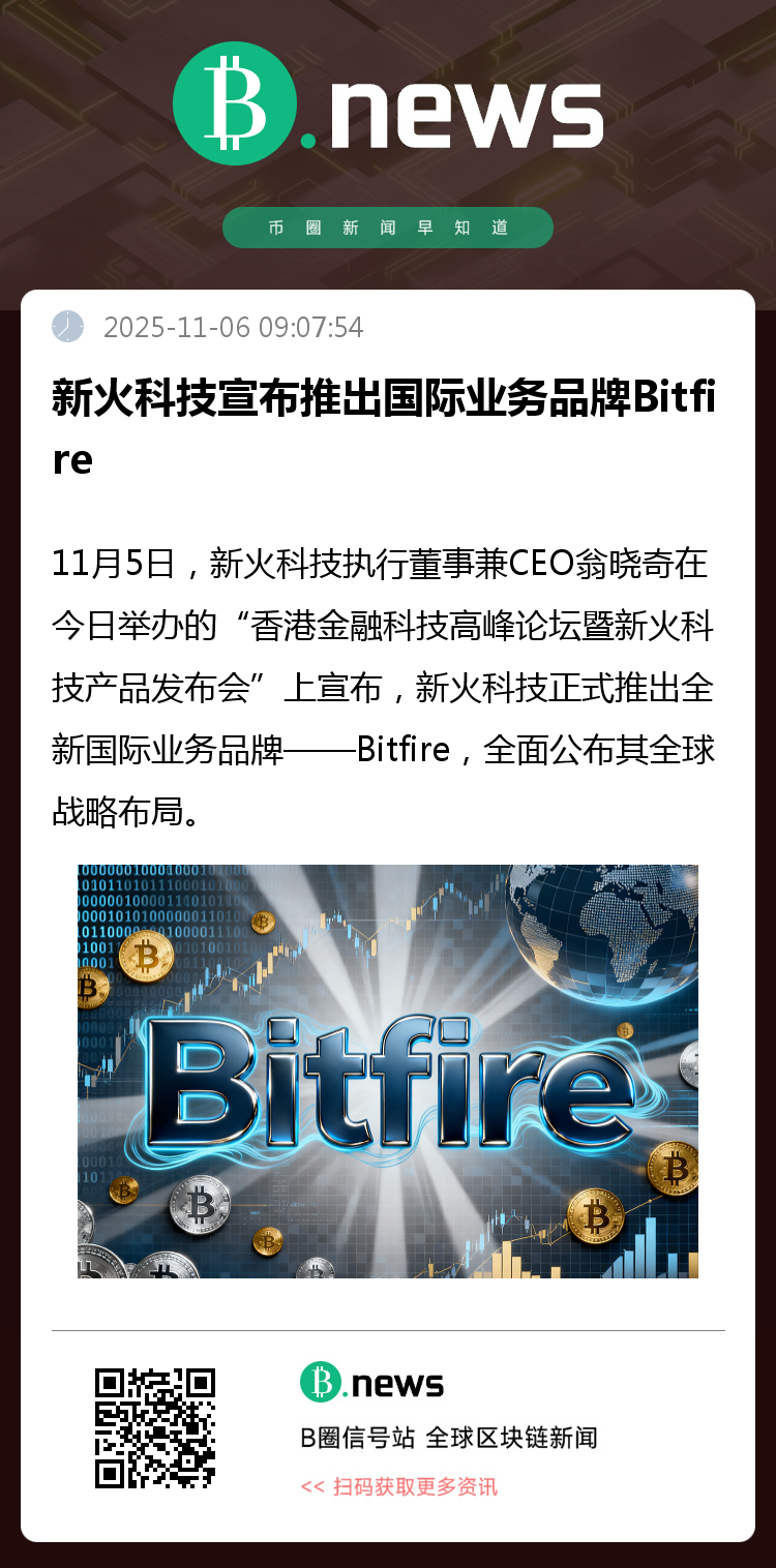 在11月5日举行的“香港金融科技高峰论坛暨新火科技产品发布会”上,新火科技执行董事兼CEO翁晓奇正式宣布,推出全新国际业务品牌——Bitfire,并全面揭晓其全球化战略布局。Bitfire将立足香港,率先发布私行级数字资产管家旗舰产品——Bitfire Prime v1.0 APP,致力于为香港高净值人群与机构客户提供全方位的贴身管家式服务。
