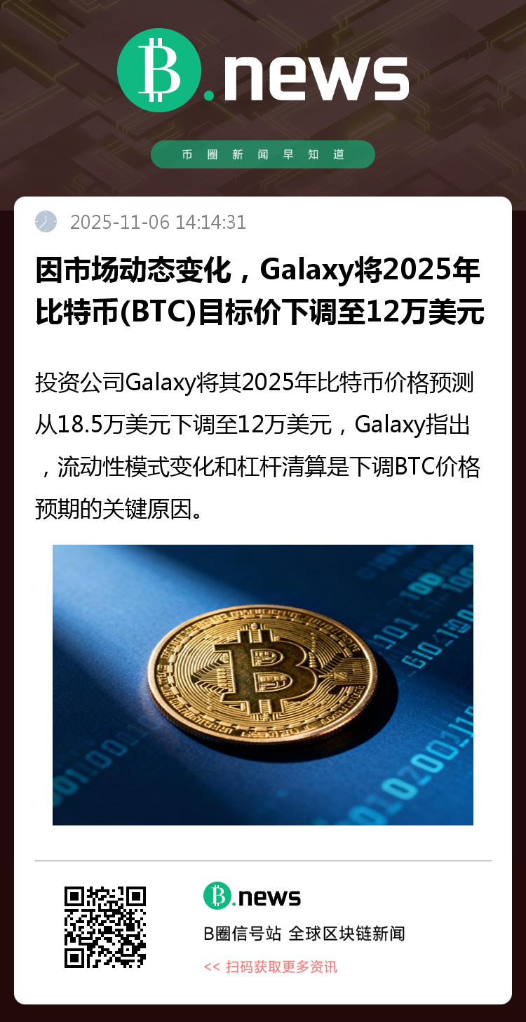 投资公司Galaxy将其2025年比特币价格预测从18.5万美元下调至12万美元,理由是面临多重阻力,以及由于被动投资资金流入交易所交易基金(ETF)和金融机构而导致的价格波动性减弱。