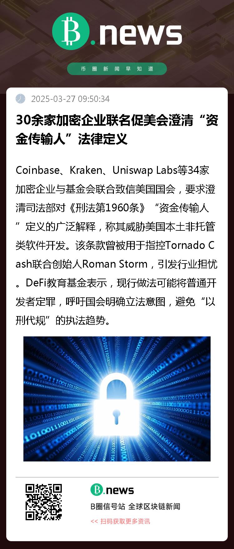 据Decrypt报道,Coinbase、Kraken、Uniswap Labs等34家加密企业与基金会联合致信美国国会,要求澄清司法部对《刑法第1960条》“资金传输人”定义的广泛解释,称其威胁美国本土非托管类软件开发。