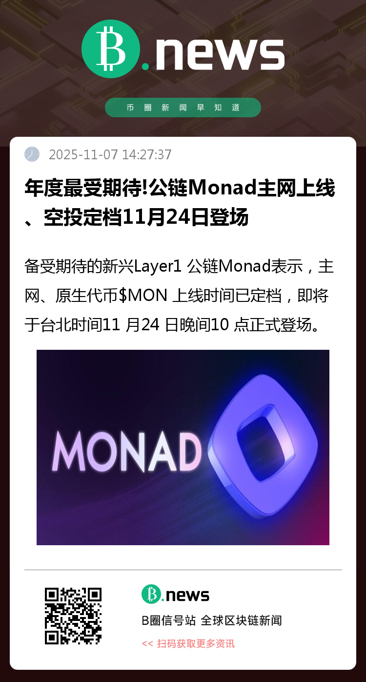 备受期待的新兴Layer1 公链Monad表示,主网、原生代币$MON 上线时间已定档,即将于台北时间11 月24 日晚间10 点正式登场。