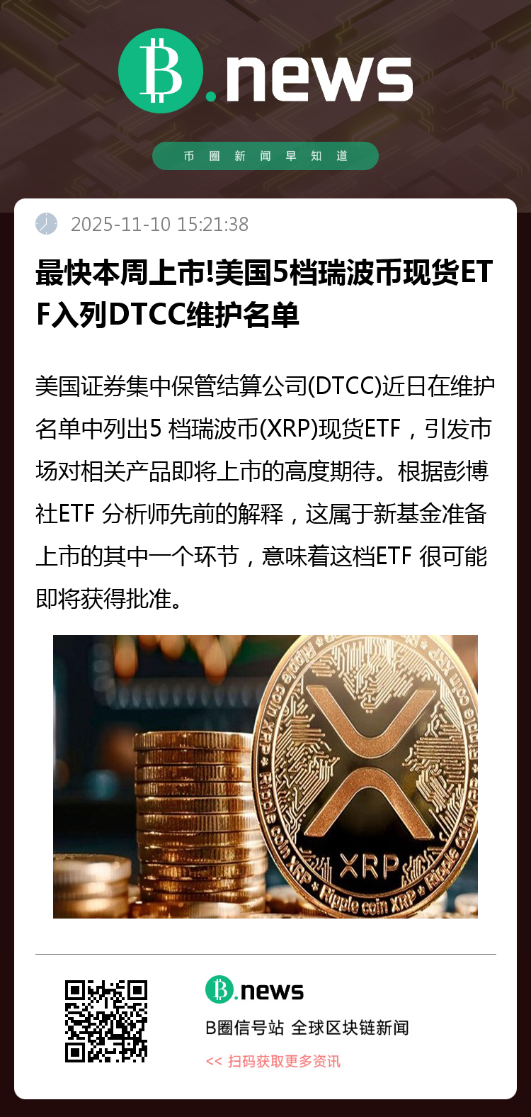 美国证券集中保管结算公司(DTCC)近日在维护名单中列出5 档瑞波币(XRP)现货ETF,引发市场对相关产品即将上市的高度期待。根据彭博社ETF 分析师先前的解释,这属于新基金准备上市的其中一个环节,意味着这档ETF 很可能即将获得批准。